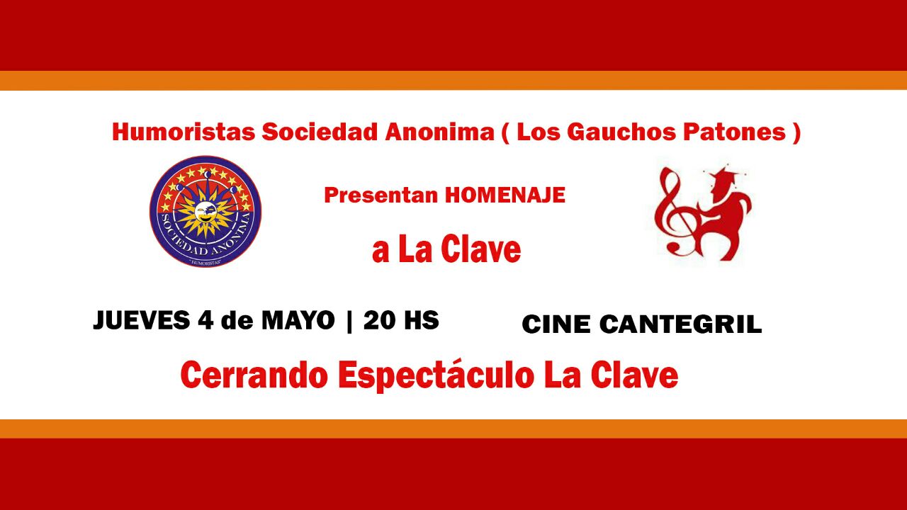 Homenaje a La Clave Humoristas Sociedad Anónima (Los Gauchos Patones) presentan un Homenaje a La Clave. Vie, 28 Abril 2017 Cuando: Jueves 4 de Mayo 20hs Dónde: Cine Cantegril Cerrando espectáculo La Clave