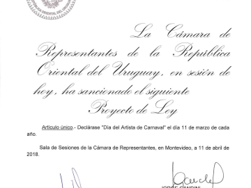 Queridos amigos , con enorme satisfacción tenemos el agrado de informarles que el Poder Legislativo estableció que a partir del próximo 11 de marzo se celebrará el "Día del Artista del Carnaval", objetivo alcanzado luego de largo trabajo que fuera emprendido por Daecpu para lograr el reconocimiento de toda la familia carnavalera.
